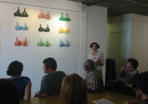 Research shows that in England one woman out of every nine will get breast cancer. In this installation I have used two sets of nine ceramic bras. In each set eight of the bras have luscious, ripe fruit like colours to represent the healthy breast, and I have used black for the ninth to depict the cancer victim. In the middle of the two sets is what I have called the International Altar. This altar holds objects that inform about the breast cancer and the stories of different sufferers. There are also 'offerings' and the audience is invited to share their experiences by tying their own offerings to the altar.